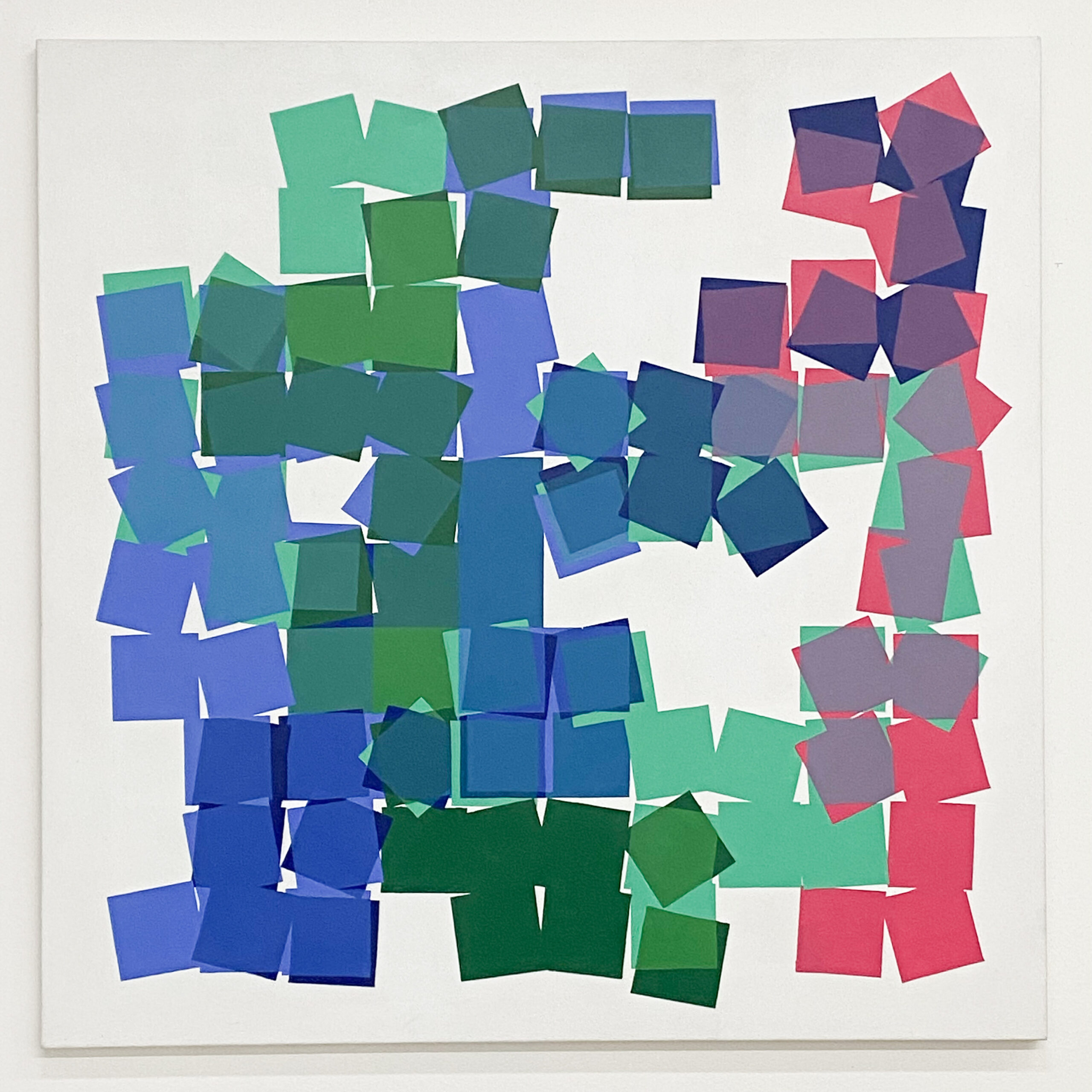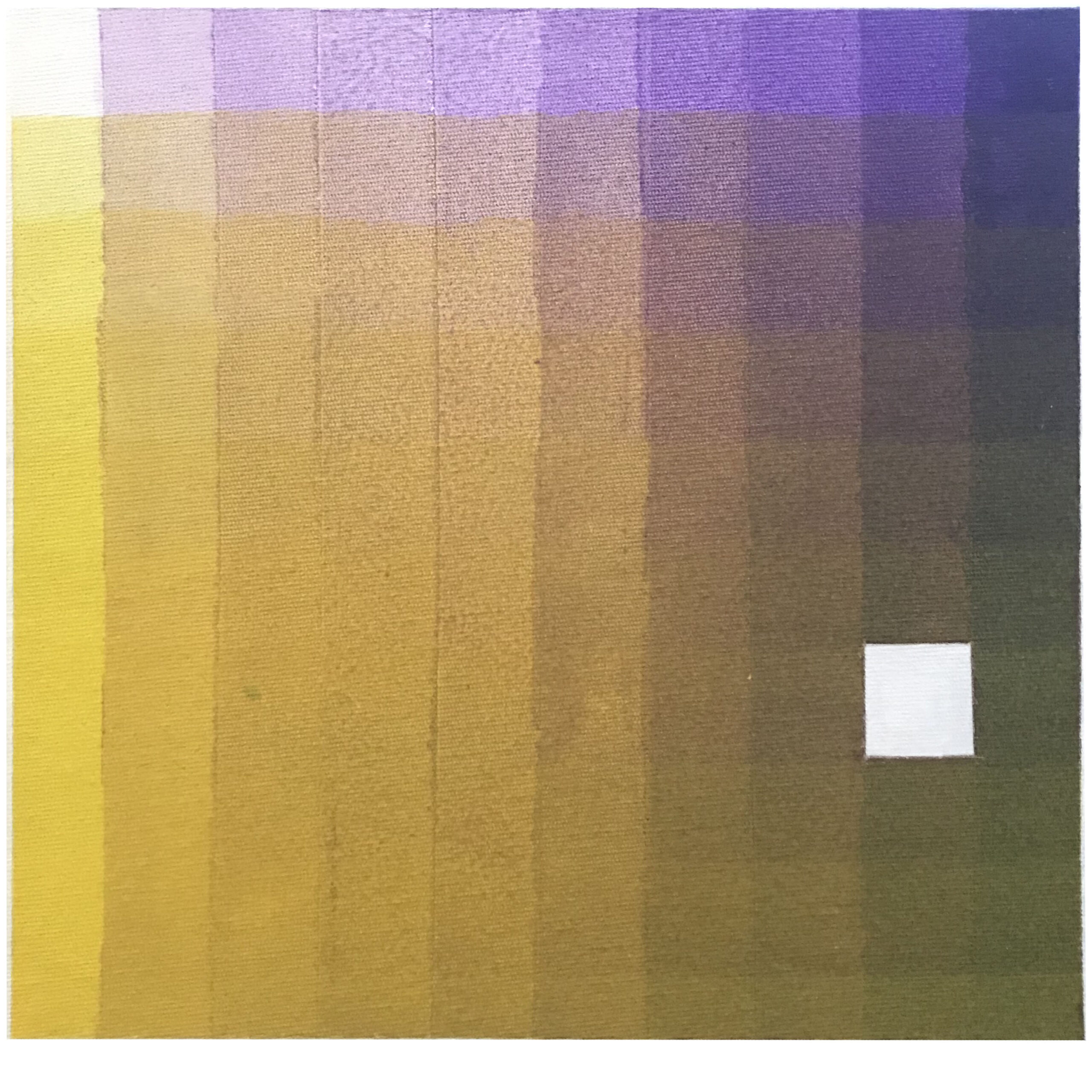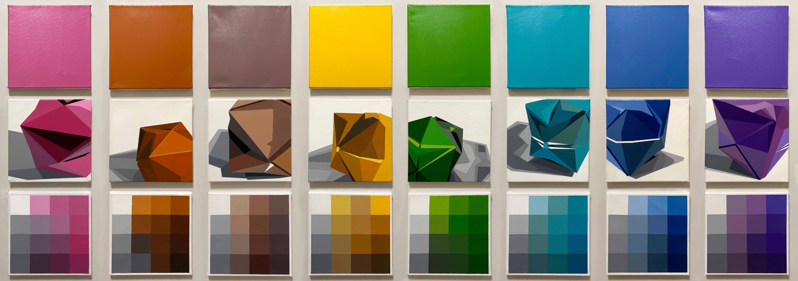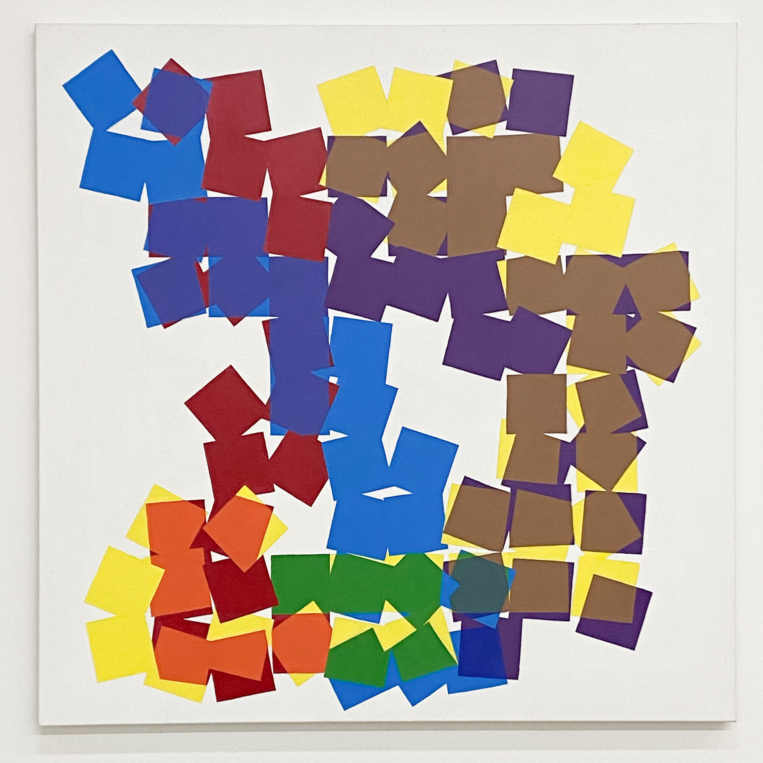 ESTUDOS CROMÁTICOS nos quais a escolha das cores e das formas é delegada. A  artista cria um procedimento, que deve executar de forma fidedigna, e deixar as imagens surgirem.